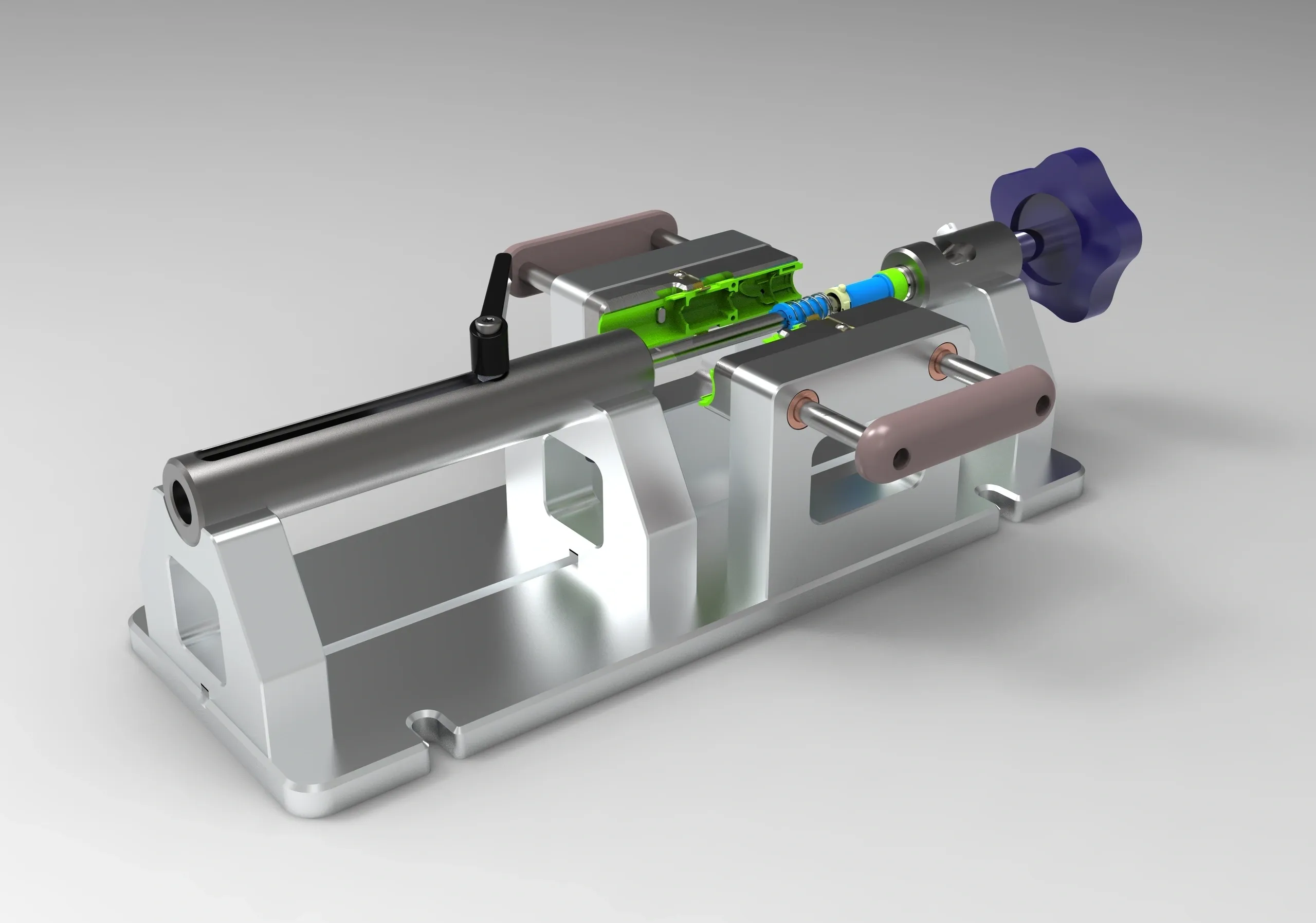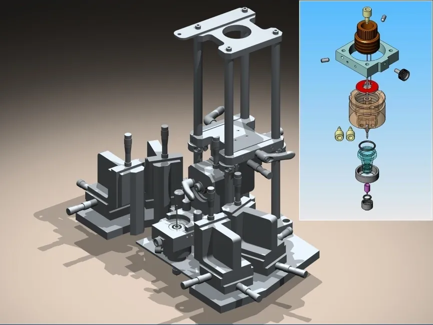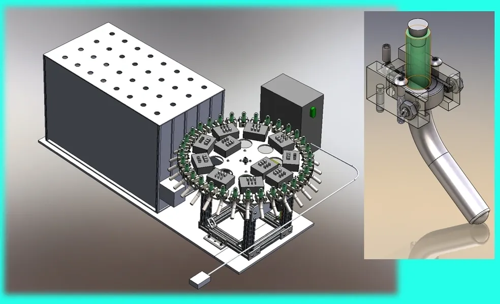 Tabletop Assembling Stage used to properly orient parts and assemble medical injectors. This tooling contributes to efficiency of manufacturing processes and reduction of labor intensity.